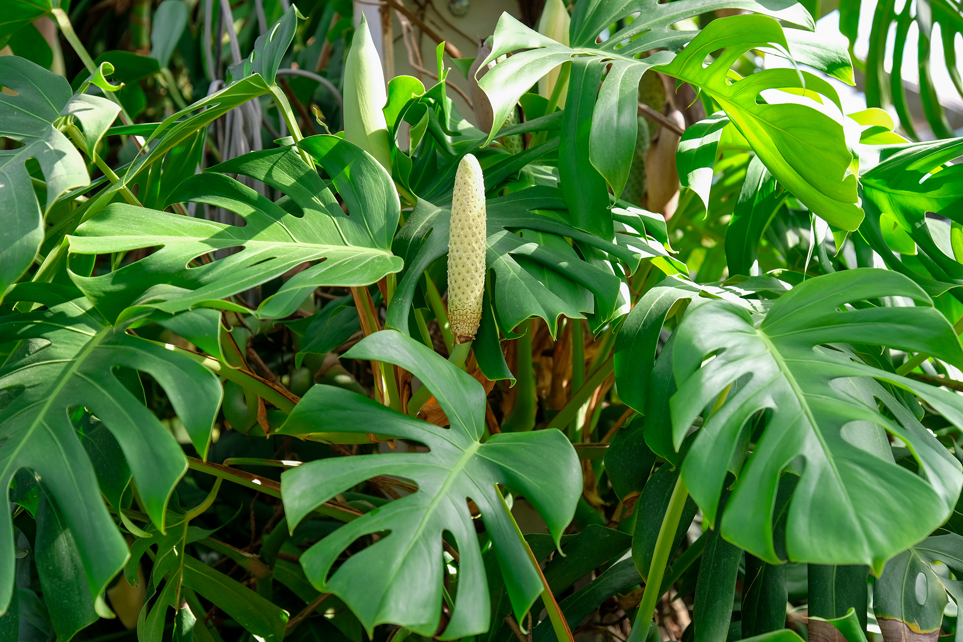 크고 광택이 있는 잎에 갈라짐과 구멍이 있어 영어권에서 스위스 치즈(Swiss Chess Plant)라는 별명을 가지고 있는 몬스테라는 그 모양 때문에 관상용 식물로 인기가 많습니다. 잎의 구멍은 열대우림에서 아래 잎들이 햇빛을 더 받을 수 있고 강한 바람이나 비에도 잎이 찢어지지 않도록 발달한 것이라고 합니다. 공중뿌리가 발달하여 나무나 바위등 주변의 지형지물을 타고 올라가는 습성이 있습니다.